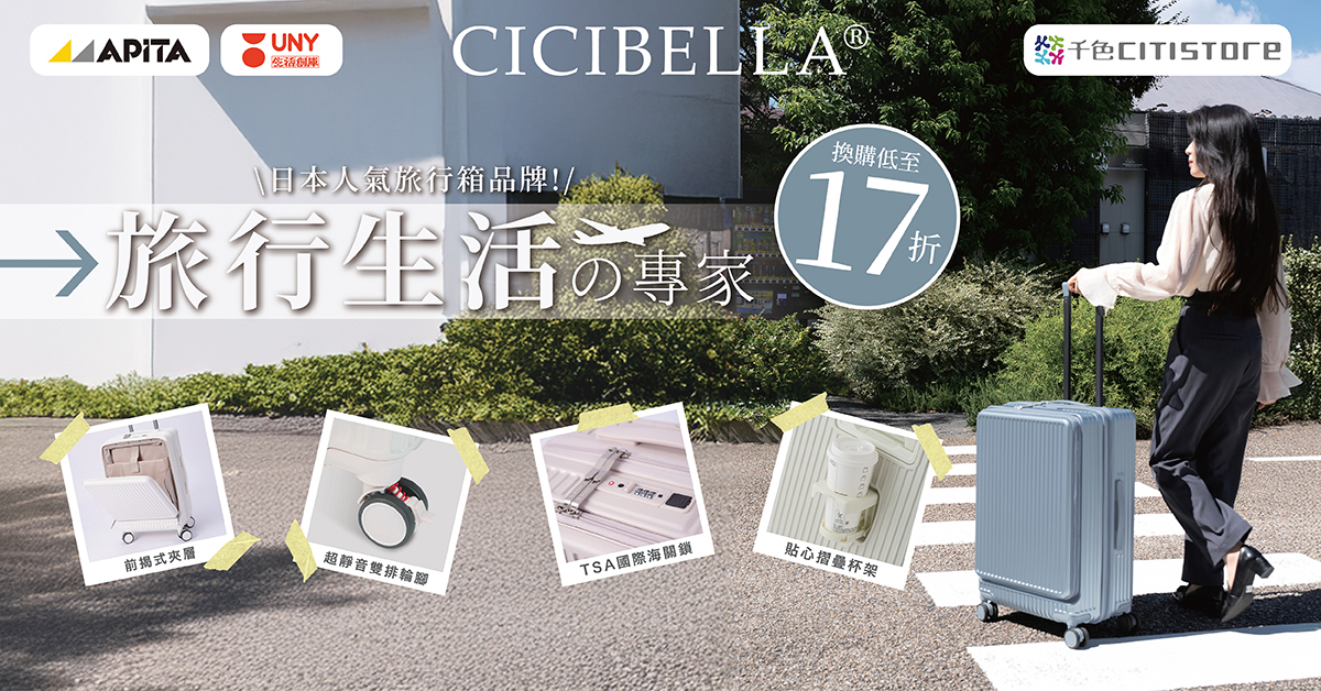 由即日起至6月11日,凡於APITA或UNY購物滿$300*,即可以低至17折優惠價 換購「CICIBELLA 旅行生活の專家」商品,CU APP會員更專享會員...